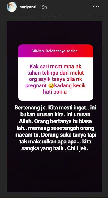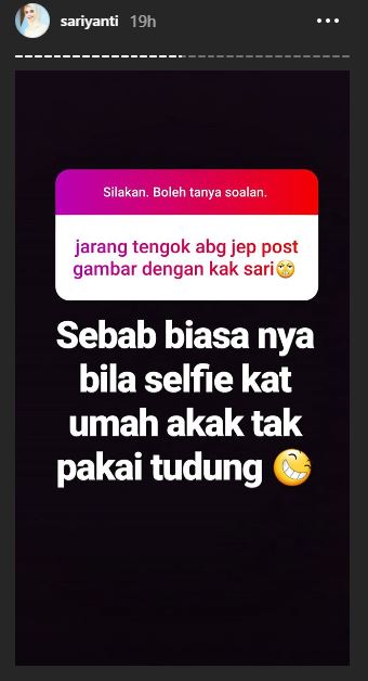 Terdahulu, Sari telah membuka ruangan soalan untuk menjawab apa sahaja pertanyaan yang diajukan oleh peminat-peminatnya menerusi Insta Story.