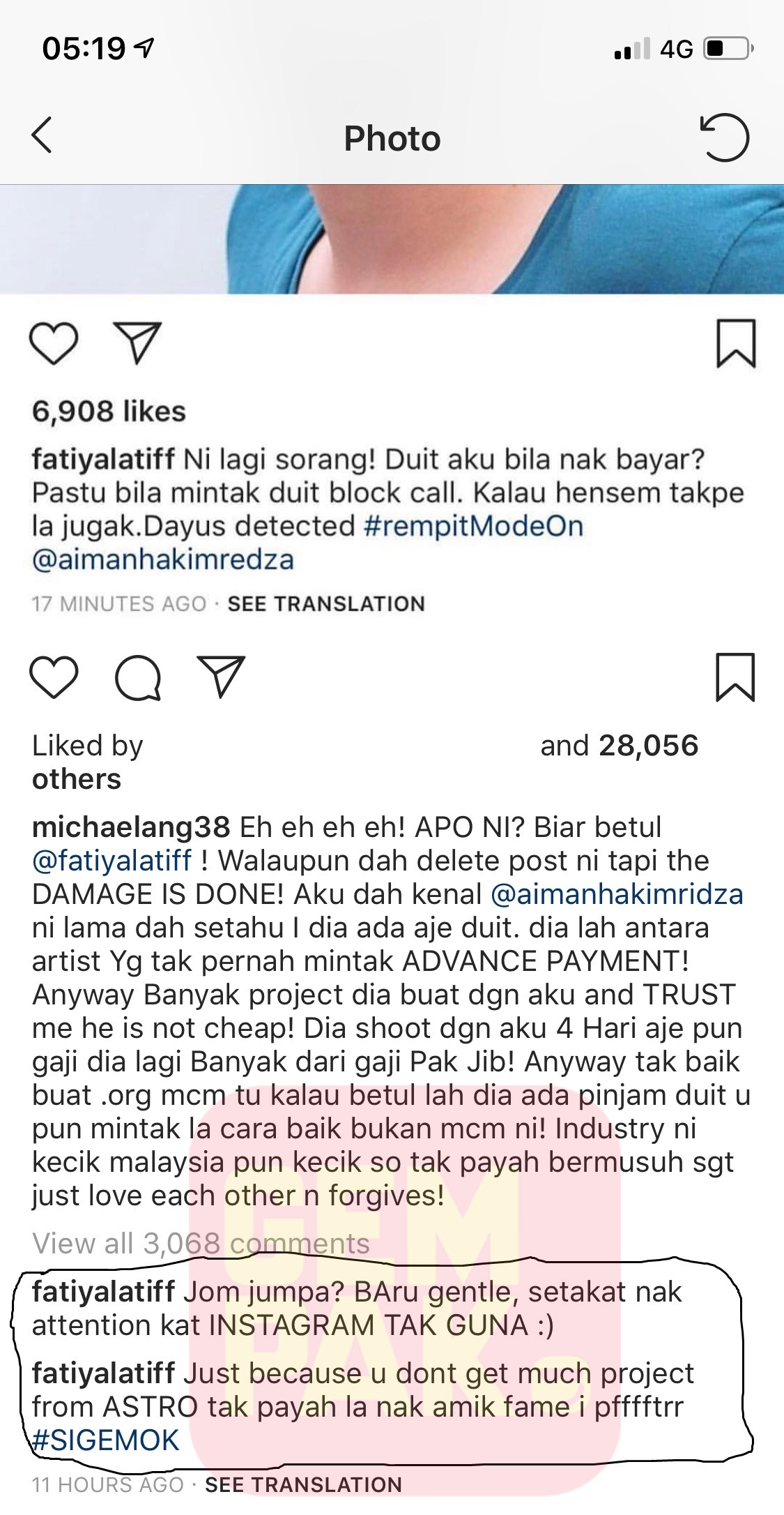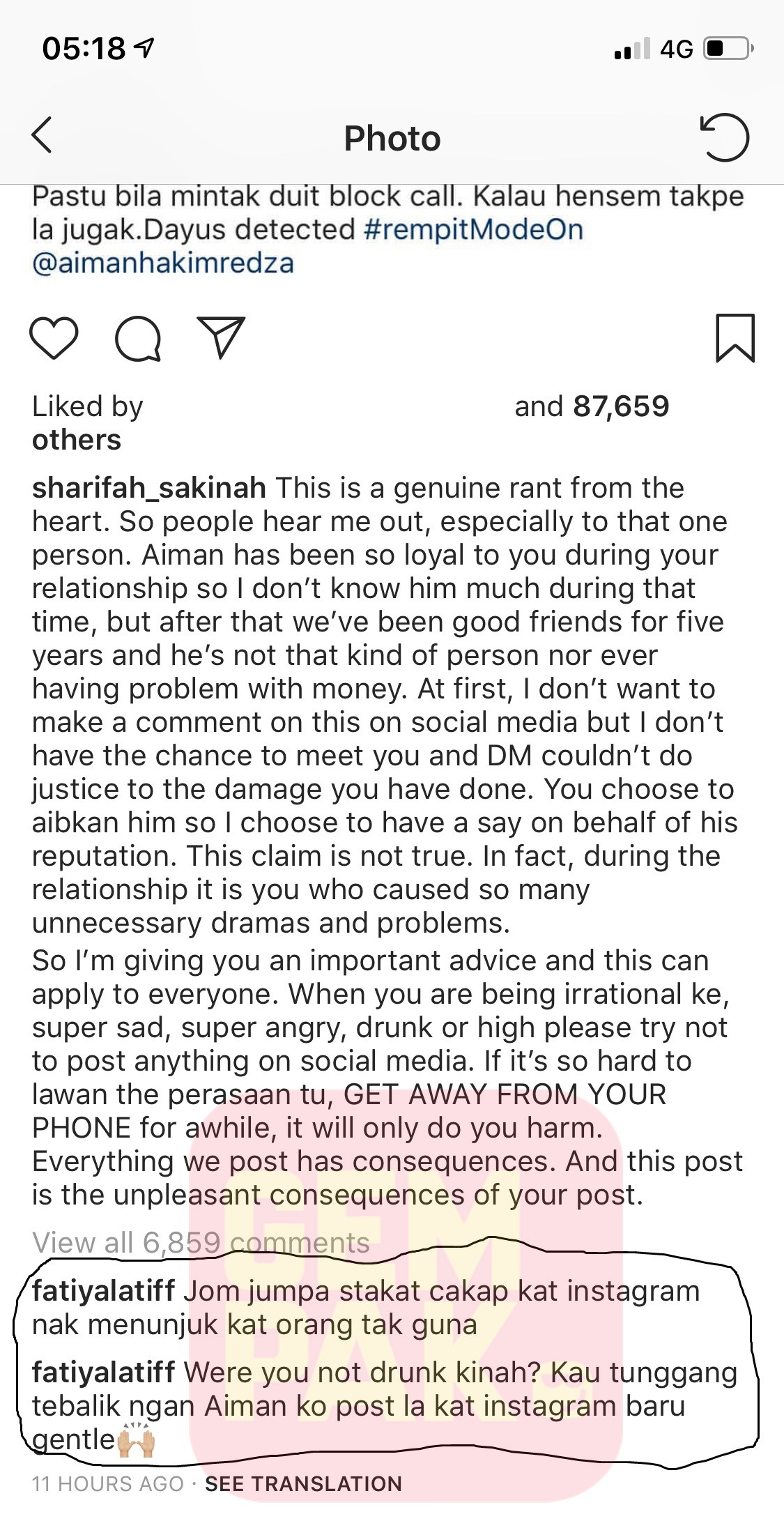 Tindakan pengarah Michael Ang dan aktres Sharifah Sakinah tampil mempertahankan aktor Aiman Hakim Ridza di laman sosial Instagram masing-masing mendapat perhatian pelakon Fathia Latiff.