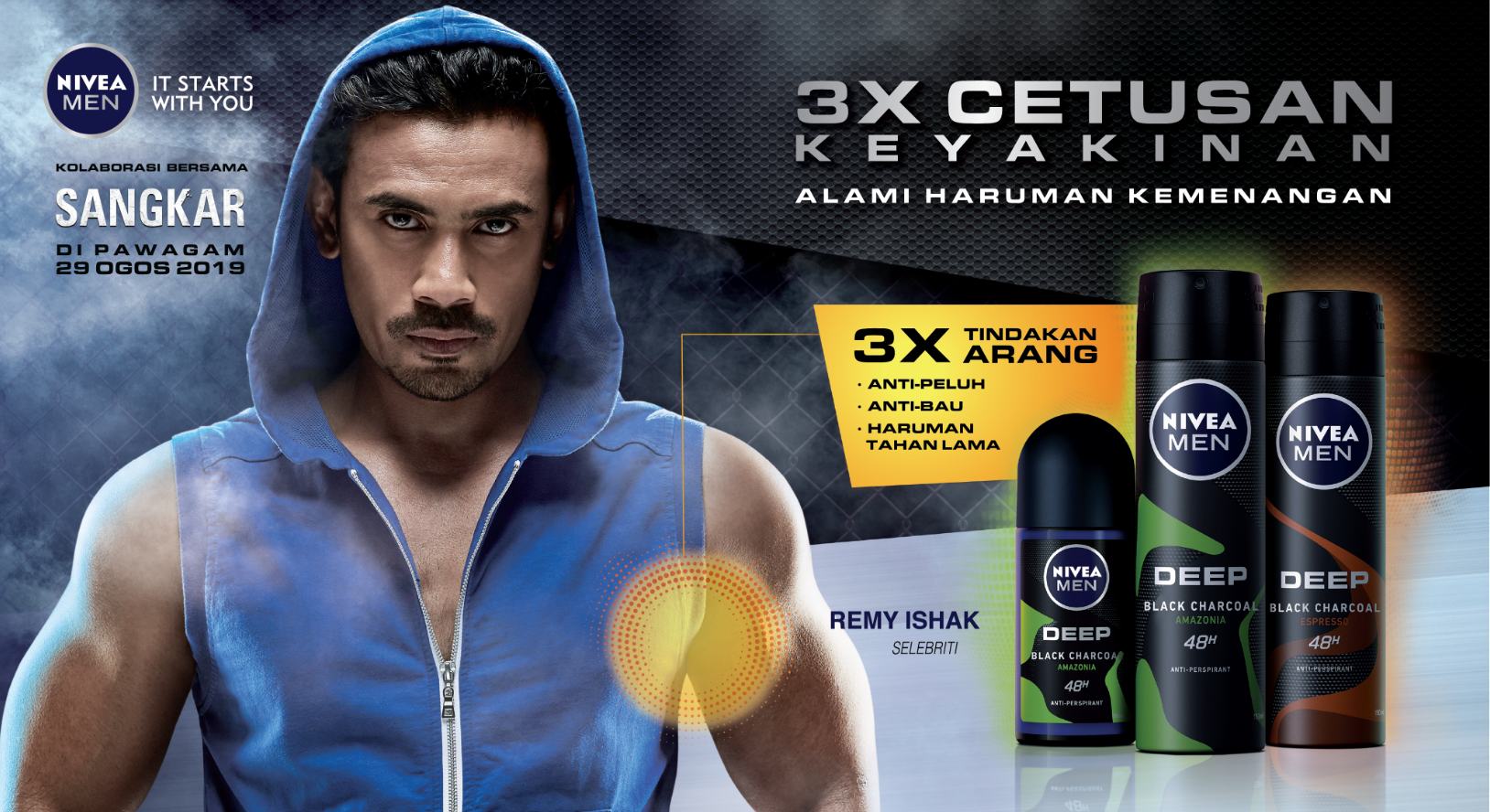 Rangkaian produk deodoran NIVEA MEN Deep - Amazonia & Espresso boleh dijadikan teman setia seseorang lelaki. Antara manfaat NIVEA MEN Deep Range dengan 3X tindakan iaitu anti-peluh, anti-bau dan haruman yang tahan lama, sudah tentu lelaki akan sukakannya. Begitu juga dengan Remy, tidak hairan lah dia beraksi hebat dalam filem Sangkar.
