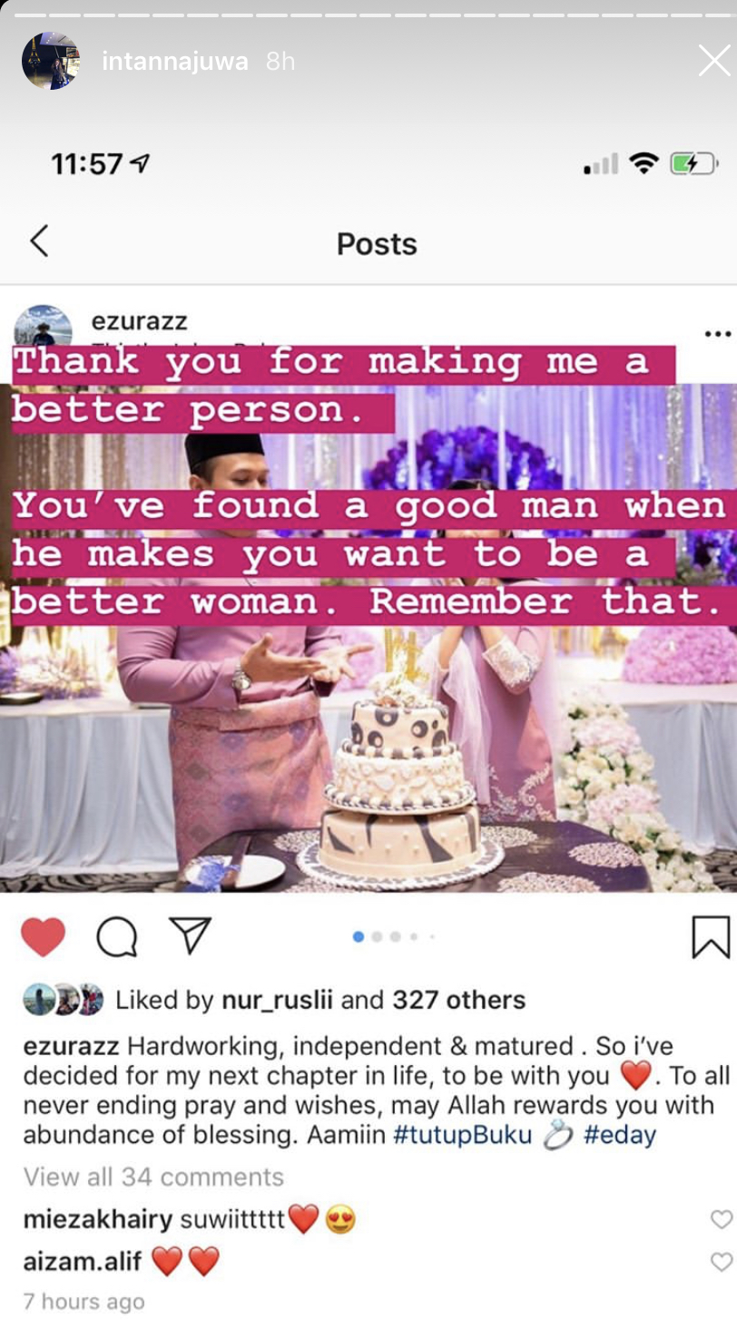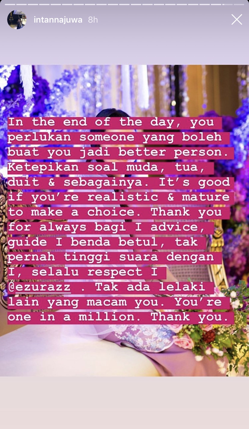 "Doakan lah yang baik-baik untuk @intannajuwa semoga hubungan ni sampai ke jinjang pelamin dan kekal selamanya," tulisnya.