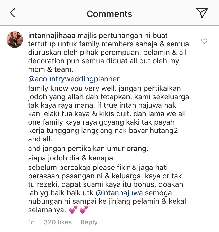 Semua ini gara-gara foto pertunangan Intan, 22, bersama tunangnya seorang ahli perniagaan, Razrul Anwar Rusli, 38 yang dikongsikan di akaun Instagram (IG) miliknya.