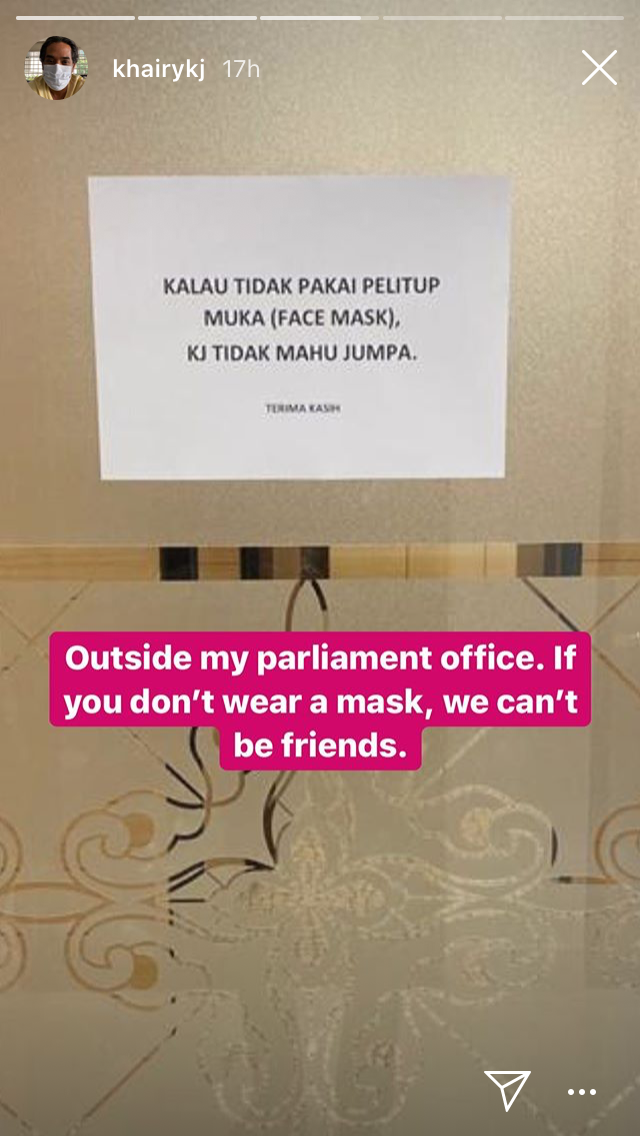 “Kalau tidak pakai pelitup muka (face mask), KJ tidak mahu jumpa,” tulis notis itu lagi.