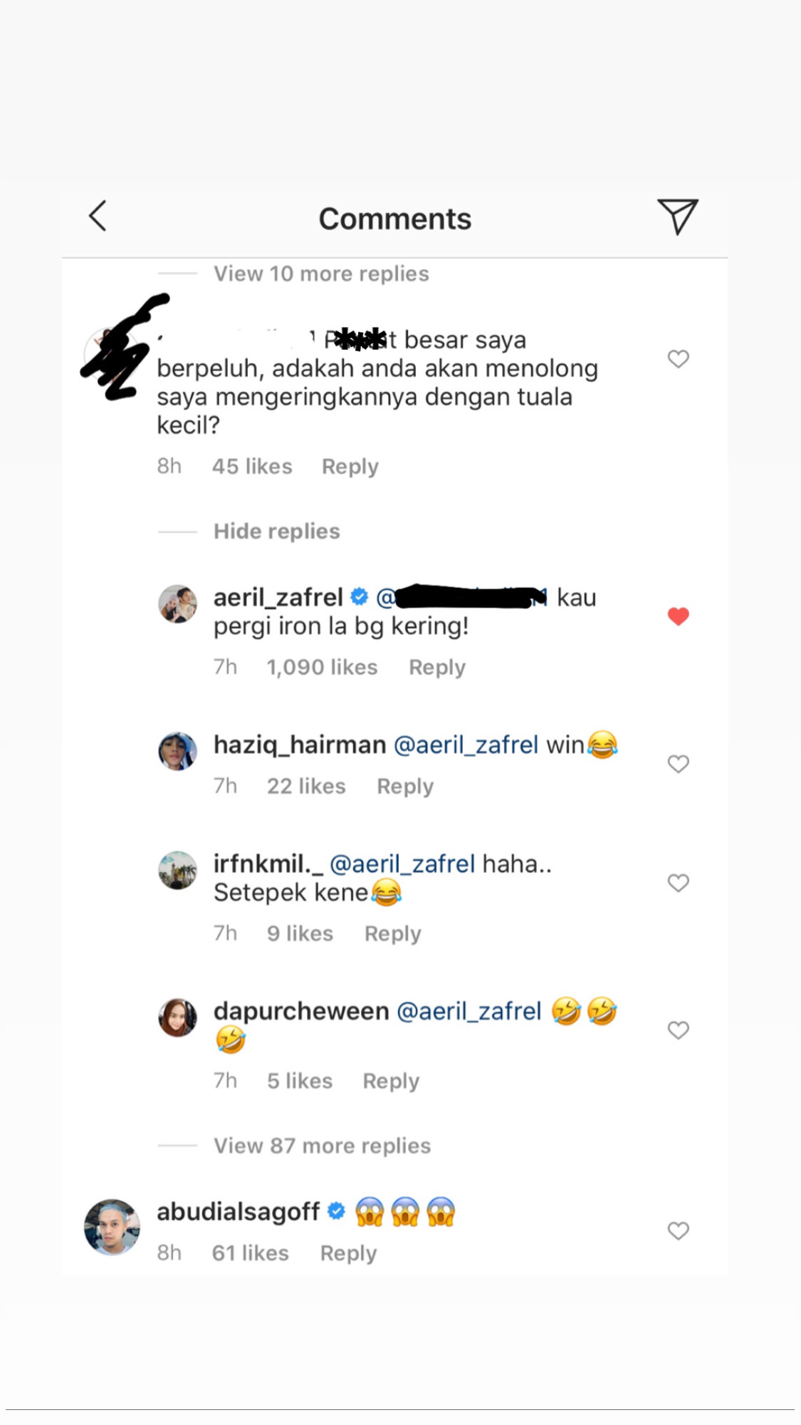 Respon Aeril itu mendapat lebih seribu tanda suka dari wargamaya, tidak kurang juga yang membalas komen tersebut mengatakan mereka terhibur.