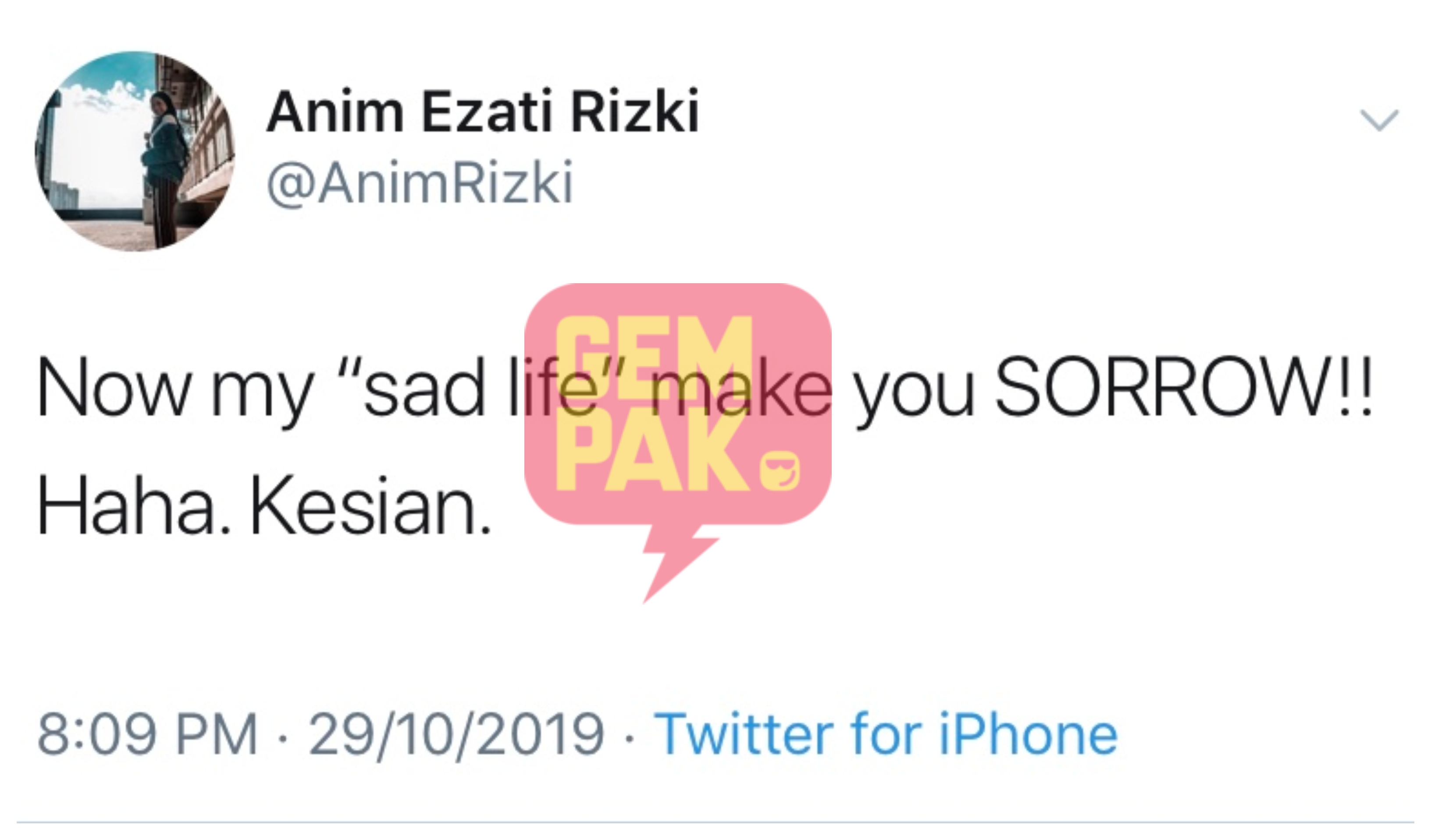 "Sekarang kehidupan sedih saya membuat awak sedih! Haha.