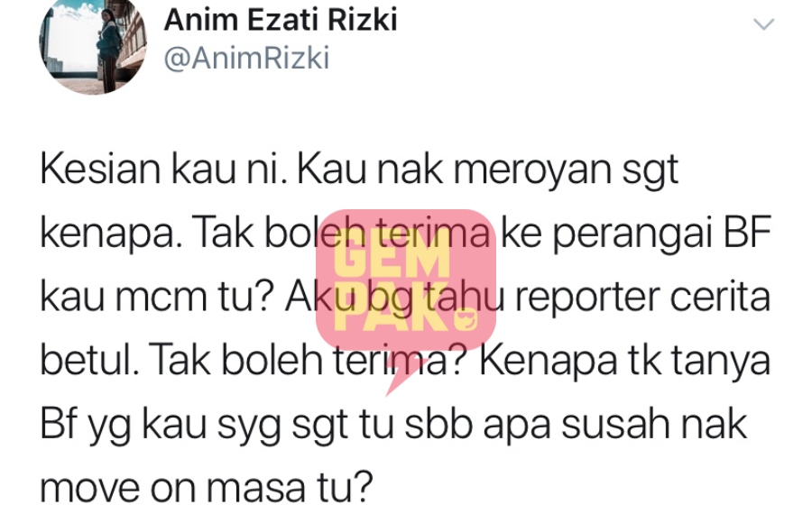 "Aku bagi tahu wartawan cerita betul. Tak boleh terima? Kenapa tak tanya teman lelaki yang kau sayang sangat tu sebab apa susah nak 'move on' masa tu?