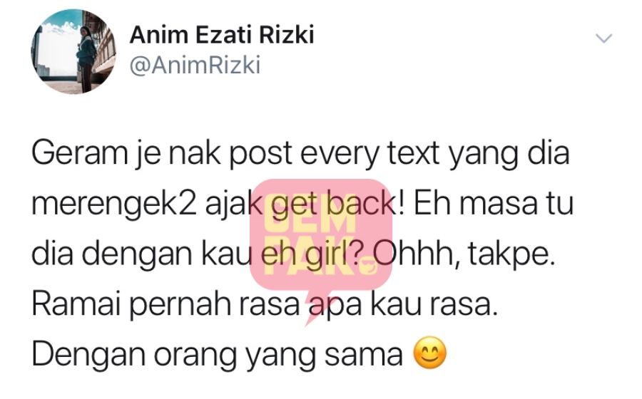 "Geram je nak kongsi setiap mesej yang dia merengek-rengek ajak kembali bersama! Eh masa tu dia dengan kau eh perempuan?