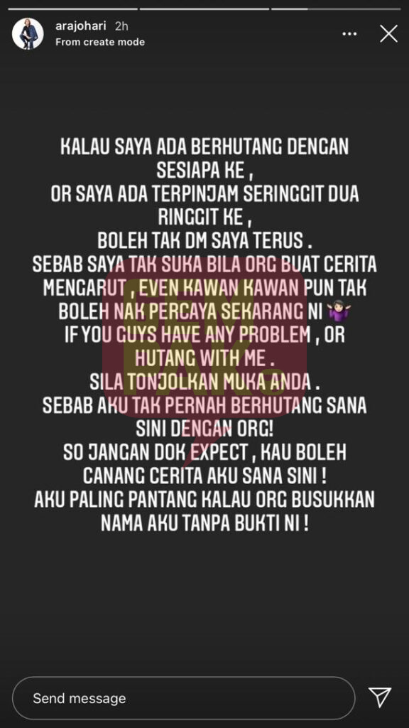"Kalau anda ada masalah atau hutang dengan saya, sila tonjolkan muka anda," tulis Ara menerusi ruangan Instagram Stories baru-baru ini.