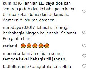 Menerusi ruangan komen rata-rata peminat turut menyampaikan ucapan selamat pengantin baru selain mendoakan kebahagiaan pasangan sweet ini.