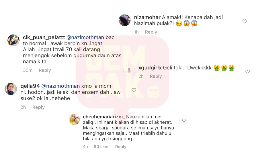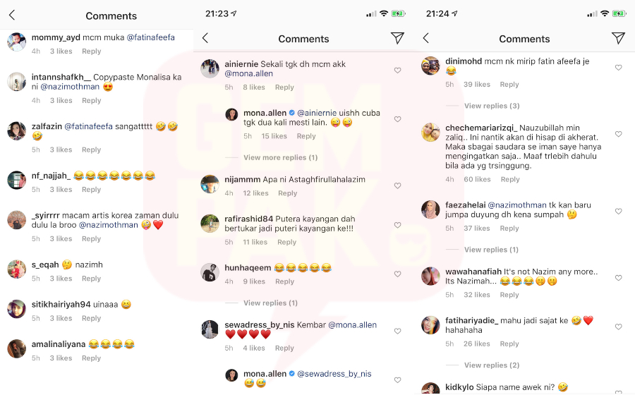 Ada juga pengikut Nazim yang menyamakan wajah Nazim yang bersolek seperti pelakon Fatin Afeefa dan Mona Allen.
