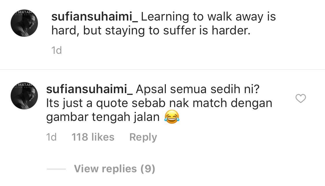 "Apasal semua sedih ni? It's just a quote sebab nak match dengan gambar tengah jalan," kata Sufian.