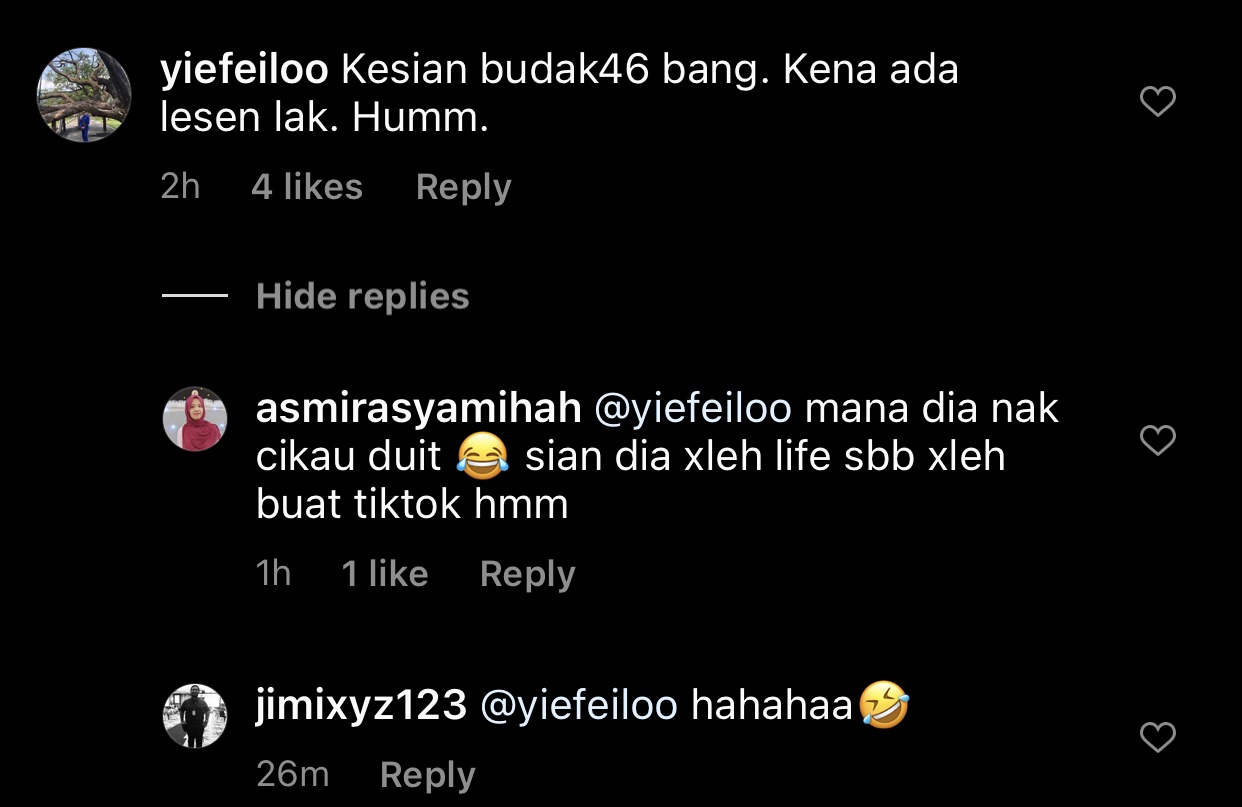 “Mana dia nak cekau duit, kesian dia tak boleh buat TikTok,” kata seorang lagi.