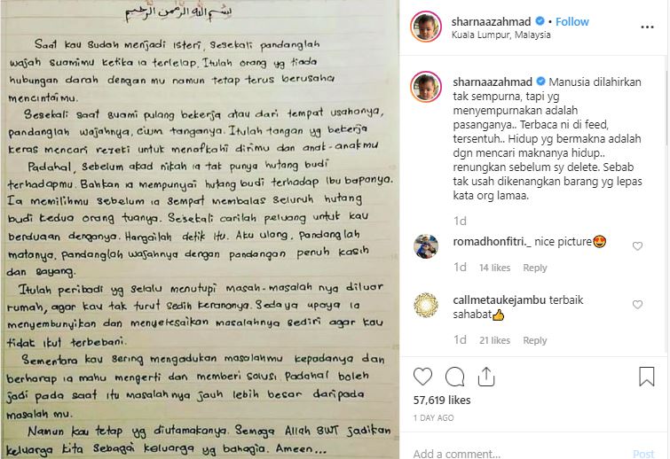 Perkongsian pelakon Sharnaaz Ahmad mengenai sepucuk surat yang menceritakan tentang pengorbanan seorang suami ternyata meruntun jiwa netizen serta pengikut sosial medianya.