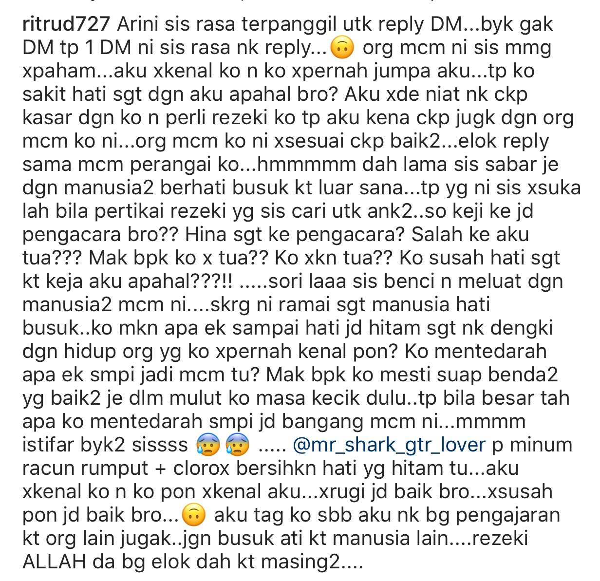 Bagaimanapun, pada salah satu screenshot yang dimuat naik Rita, jelas menampakkan perasaan geram pelakon Mami Jarum itu apabila dia menulis; “Ko sakit hati dengan aku apahal??? Aku ada mengo***ek dengan bapak ko ke?” sebagai balasan kepada mesej peribadi yang dihantar @mr_shark_gtr_lover kepadanya.