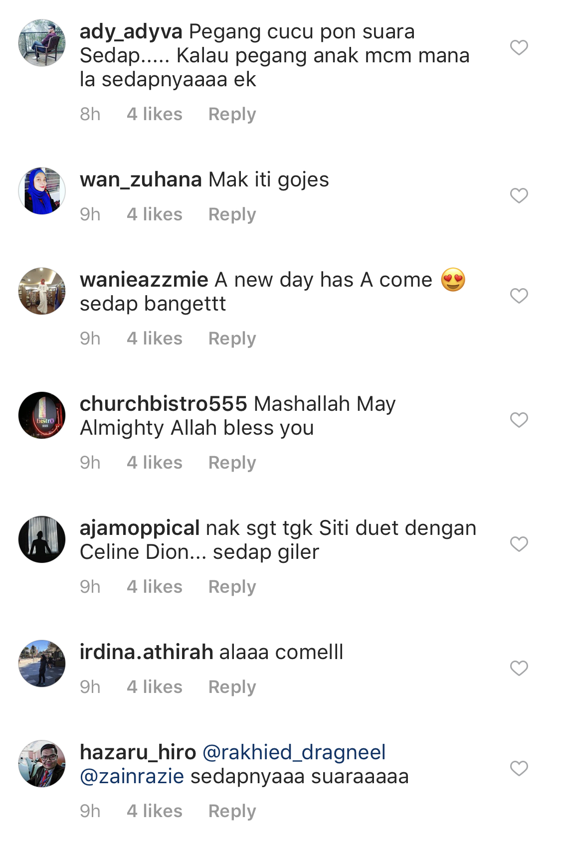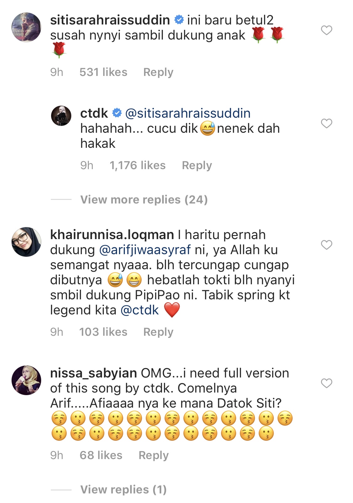 Penyanyi Siti Sarah turut meninggalkan komen memuji kebolehan Siti.
