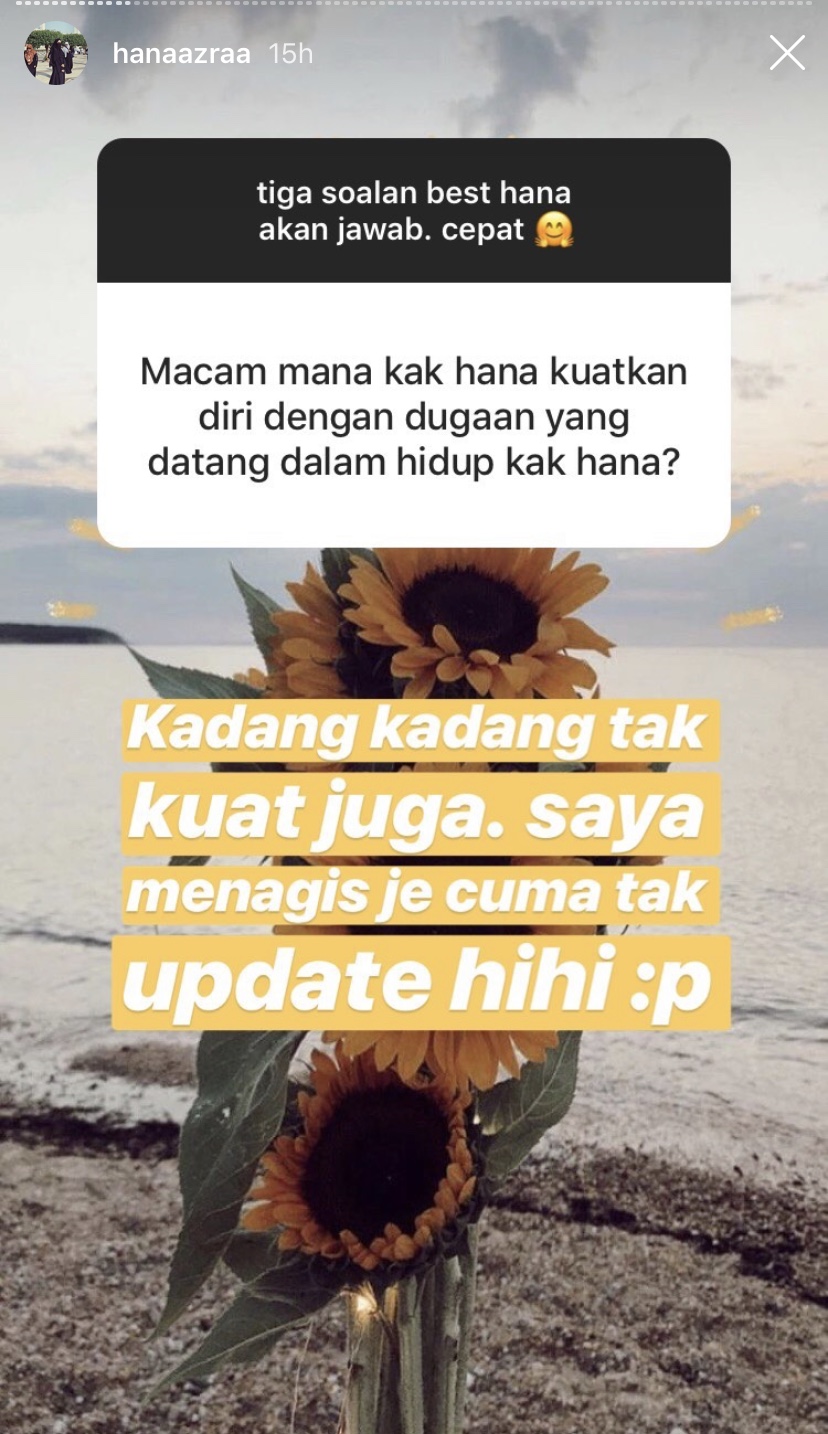 Terdahulu, Hana telah membuka ruangan soalan untuk menjawab apa saja pertanyaan yang diajukan oleh pengikutnya menerusi Instagram (IG) miliknya.