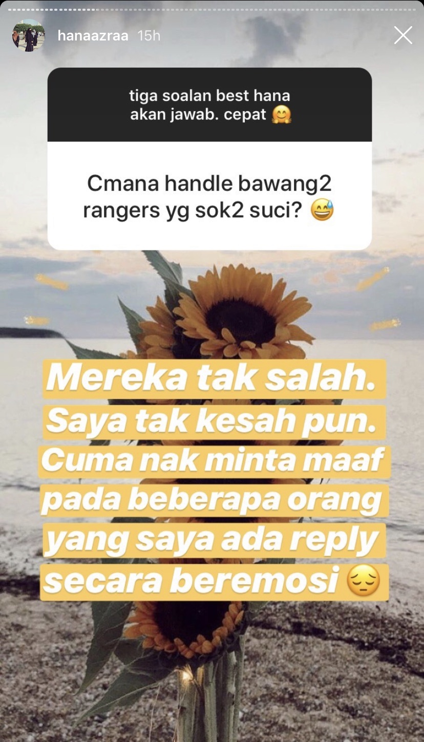 Namun begitu, Hana tidak menyalahkan malah memohon maaf kepada netizen yang menerima komen balas daripadanya.