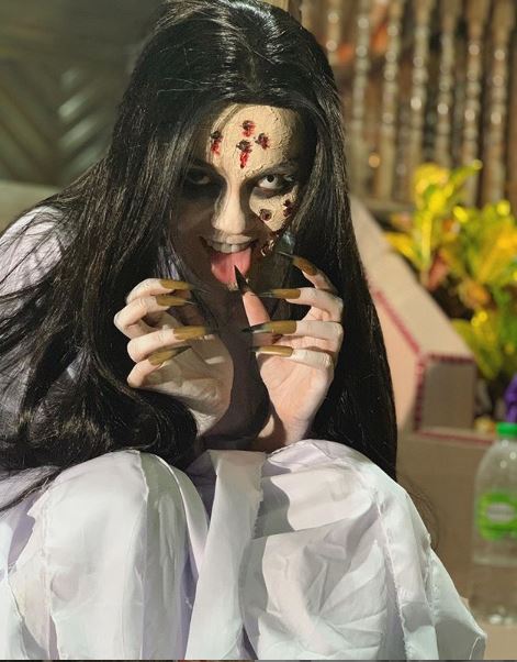 Menerusi laman sosial Instagram, Uqasha berkongsi foto seram dirinya disolek dan berpakaian seperti hantu pontianak.