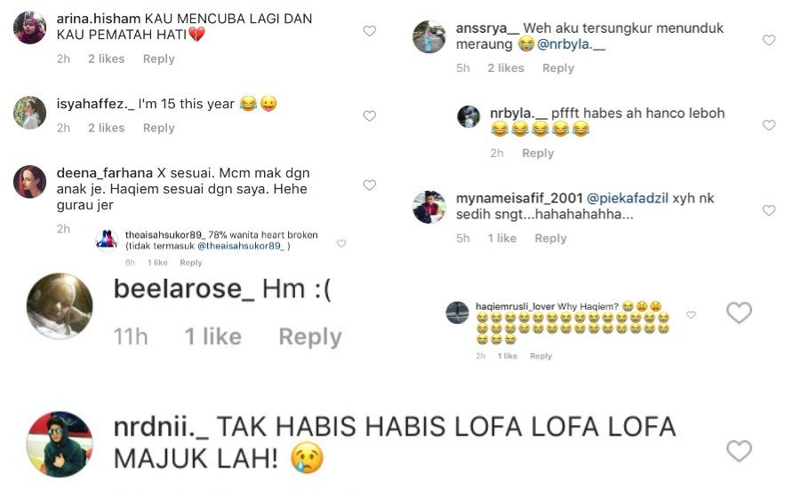 Rata-rata peminat meninggalkan komen secara gurauan dengan mengatakan mereka 'patah hati' serta 'cemburu' selepas Haqiem memuat naik foto tersebut.