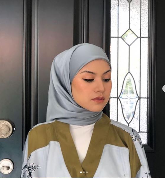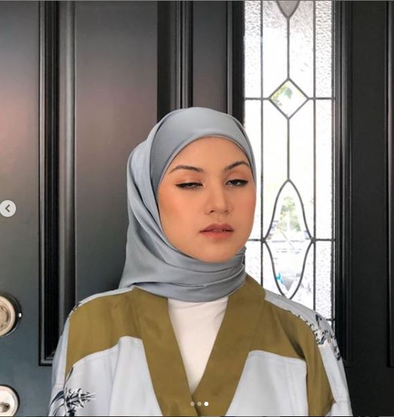 Mengenakan hijab satin bewarna kelabu dan dipadankan dengan blaus kimono berwarha hijau lumut, Lisa tampak jelita dengan imej bertudung.