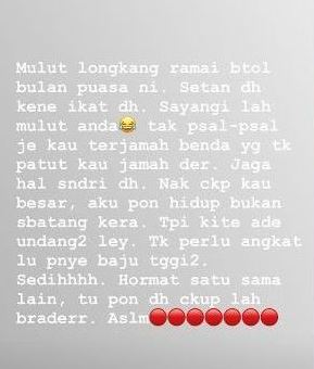 "Hormat satu sama lain, tu pun dah cukullah brader," tulis penyanyi itu.