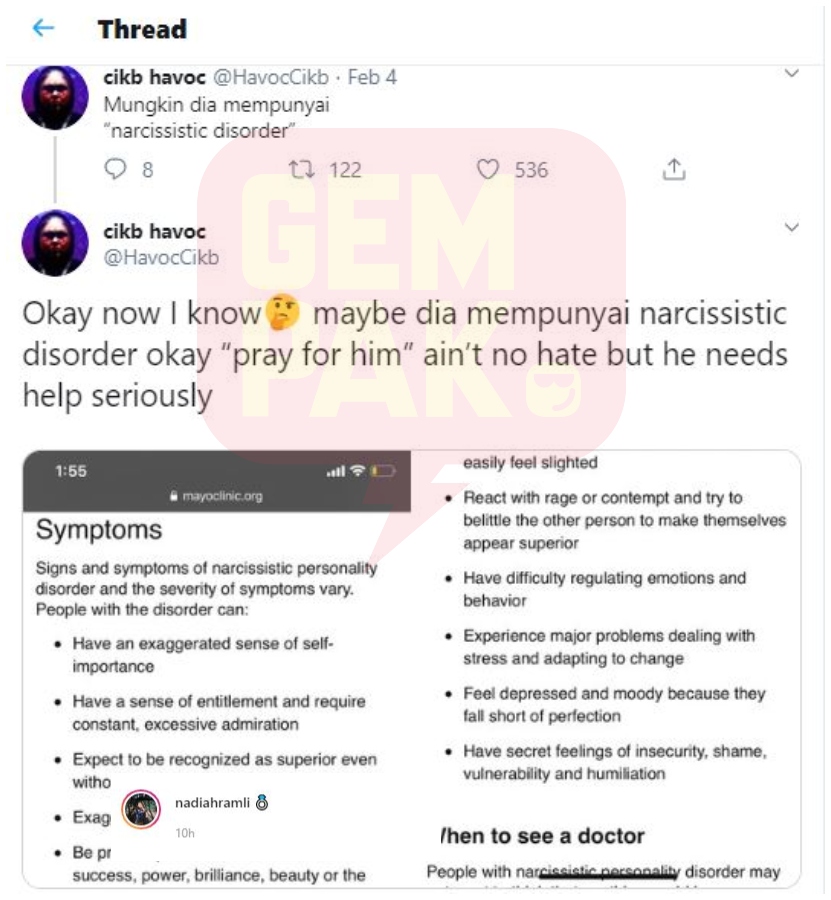 "Okay, doakan dia, bukan benci tetapi dia perlukan pertolongan (Okay now I know? maybe dia mempunyai narcissistic disorder okay “pray for him” ain’t no hate but he needs help seriously),” ciapnya.
