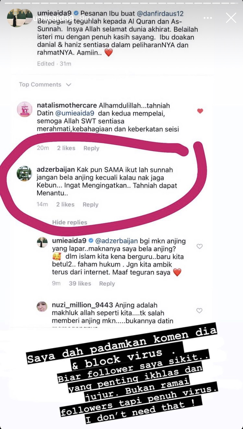 "Kak pun sama ikut lah Sunnah. Jangan bela anjing kecuali kalau nak jaga kebun. Ingat mengingatkan. Tahniah dapat menantu," tulis pemilik akaun @adzerbaijan.
