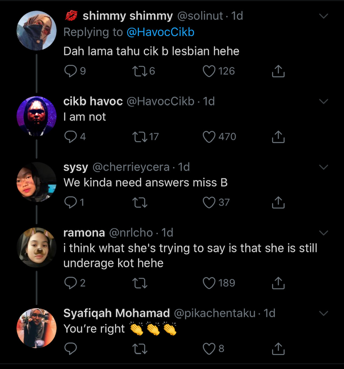 “Saya rasa apa yang Cik B nak sampaikan adalah dia masih bawah umur kot,” kata seorang wargamaya.