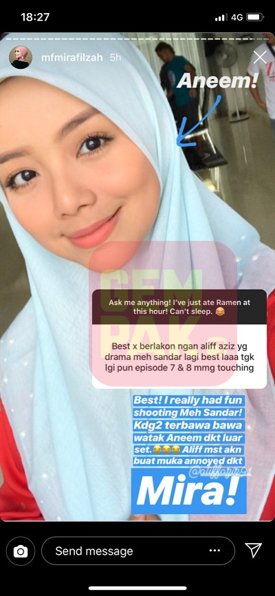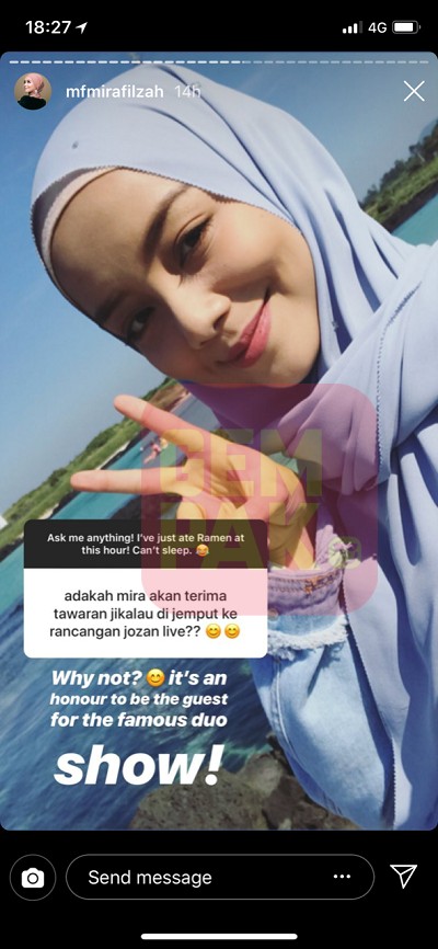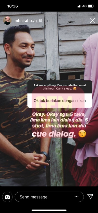 Menerusi ruangan Ask Me Question di Instagram Stories, pelakon Mira Filzah berkongsi pengalaman berlakon dengan pelawak Zizan Razak.