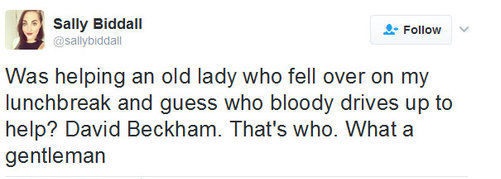 Kejadian yang belaku di kota London itu sempat dirakamkan oleh penduduk tempatan. Rata-rata peminat di laman sosial juga turut memuji sikap prihatin dan gentleman yang ditonjolkan oleh Beckham.