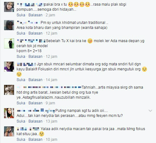 “Ramai juga yang mengatakan saya tidak memakai coli padahal saya pakai. Cuma baju itu memang begitu potongannya kerana kainnya tebal dan kalau saya pakai coli atau tak, ia tetap akan kelihatan begitu.