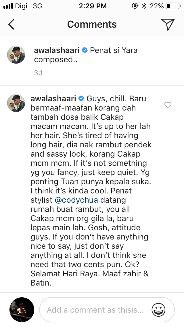 "Penat stylist datang rumah buat rambut, you all cakap macam orang gilalah, baru lepas mainlah. Gosh, attitude guys.