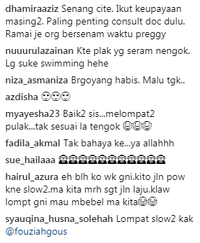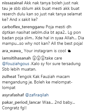 "Poja (Fouziah) mesti sudah mendapatkan nasihat sebelum dia buat apa-apa. Lagipun badan Poja slim. Tak ada hal Insya-Allah. Dia mampu, jadi kenapa tidak kan? All the best Poja," kata salah seorang pengguna.