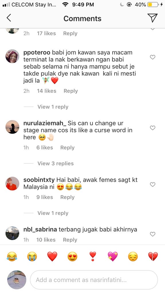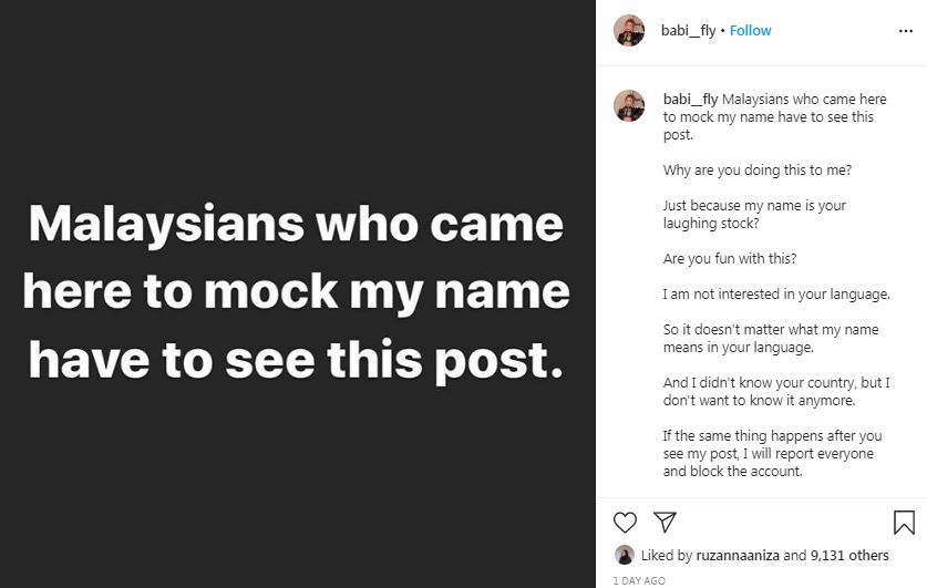 Terdahulu, akaun Instagramnya diserang pengikut dari Malaysia dengan ayat sarkastik yang mempermainkan nama pentasnya.