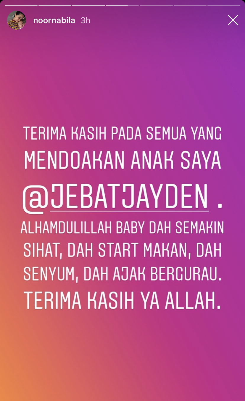 Kakak kepada pengacara Neelofa, Noor Nabila melahirkan rasa terima kasih kepada semua pihak yang mendoakan kesembuhan anaknya, Jebat Jayden.