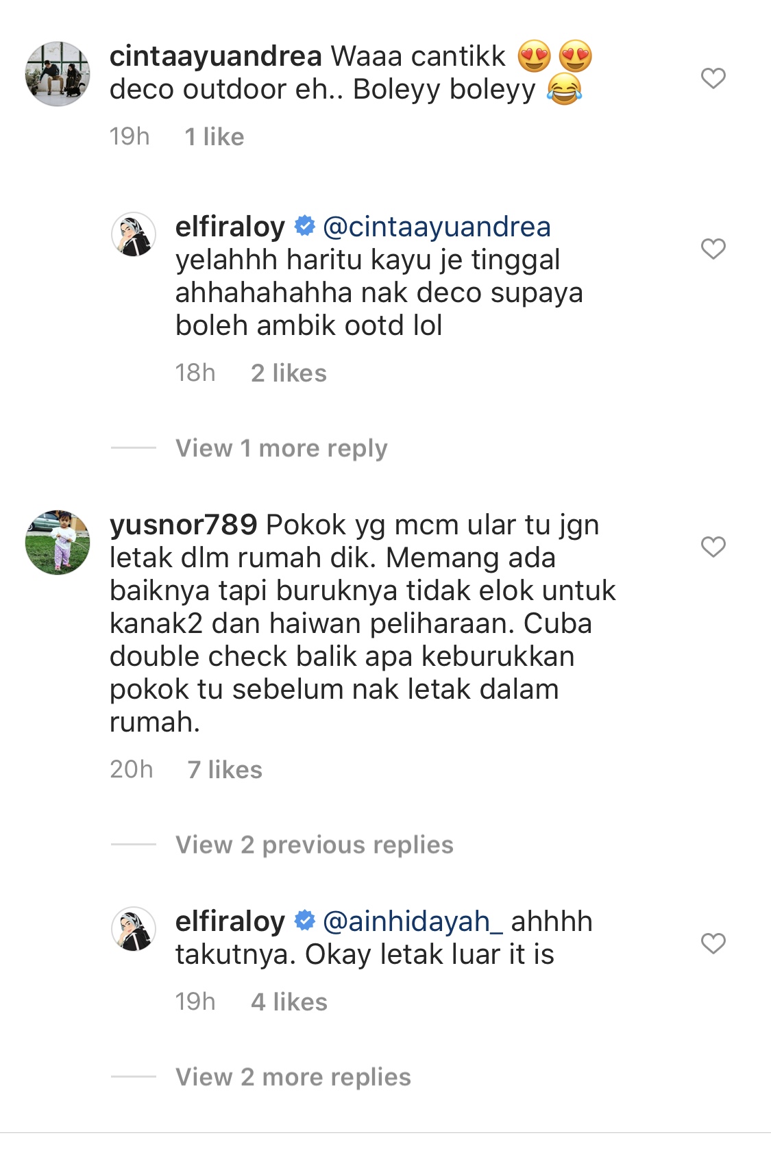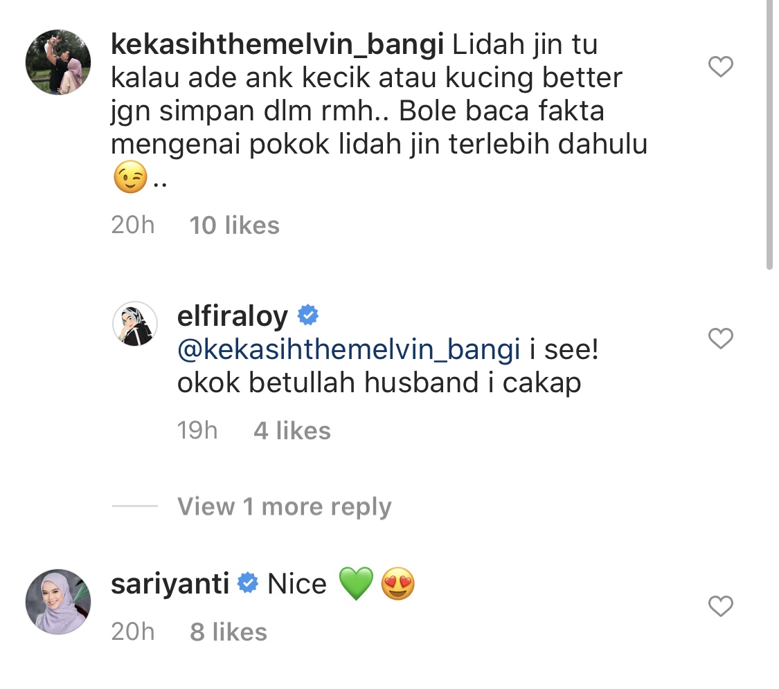 Meninjau ruangan komen entri berkenaan, rata-rata pengikut Elfira menasihatinya untuk membaca info mengenai 'Snake Plant' terlebih dahulu sebelum meletakkannya di dalam rumah kerana ia dikatakan tidak sesuai untuk bayi ataupun binatang peliharaan.
