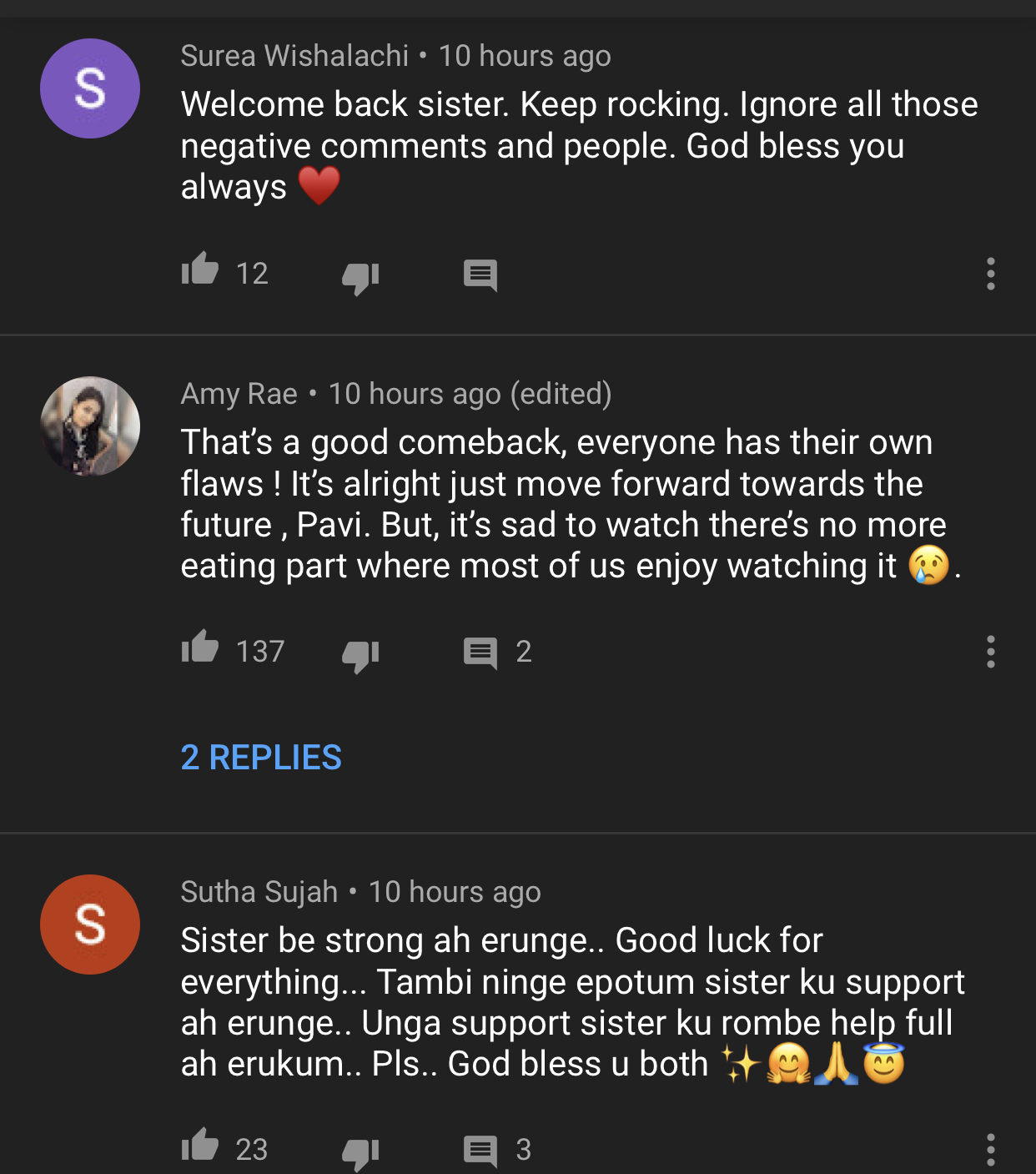 Menerusi ruang komen di YouTube tersebut, rata-ratanya telah memberi kata semangat kepada Pavithra untuk memperbanyakan video.