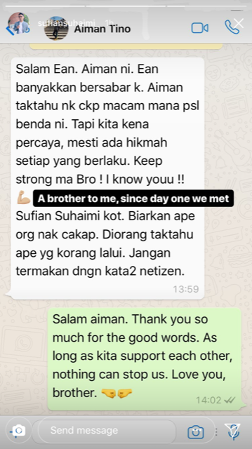 Namun begitu, Sufian ada memuat naik paparan skrin perbualan WhatsApp dan Twitter yang dihantarkan oleh tiga orang rakan selebriti, Aiman Tino, Sharnaaz Ahmad dan Heliza Helmi di ruangan Instagram Stories miliknya.