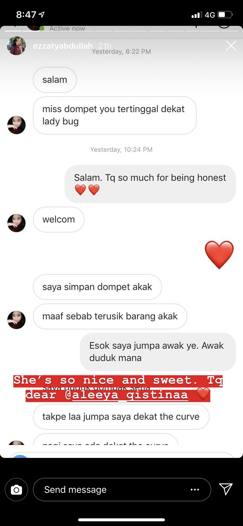 Pelakon Ezzaty Abdullah berkongsi kejadian apabila dompetnya tertinggal di sebuah kedai ditemui semula oleh seorang individu yang bernama Aleeya Qistinaa.