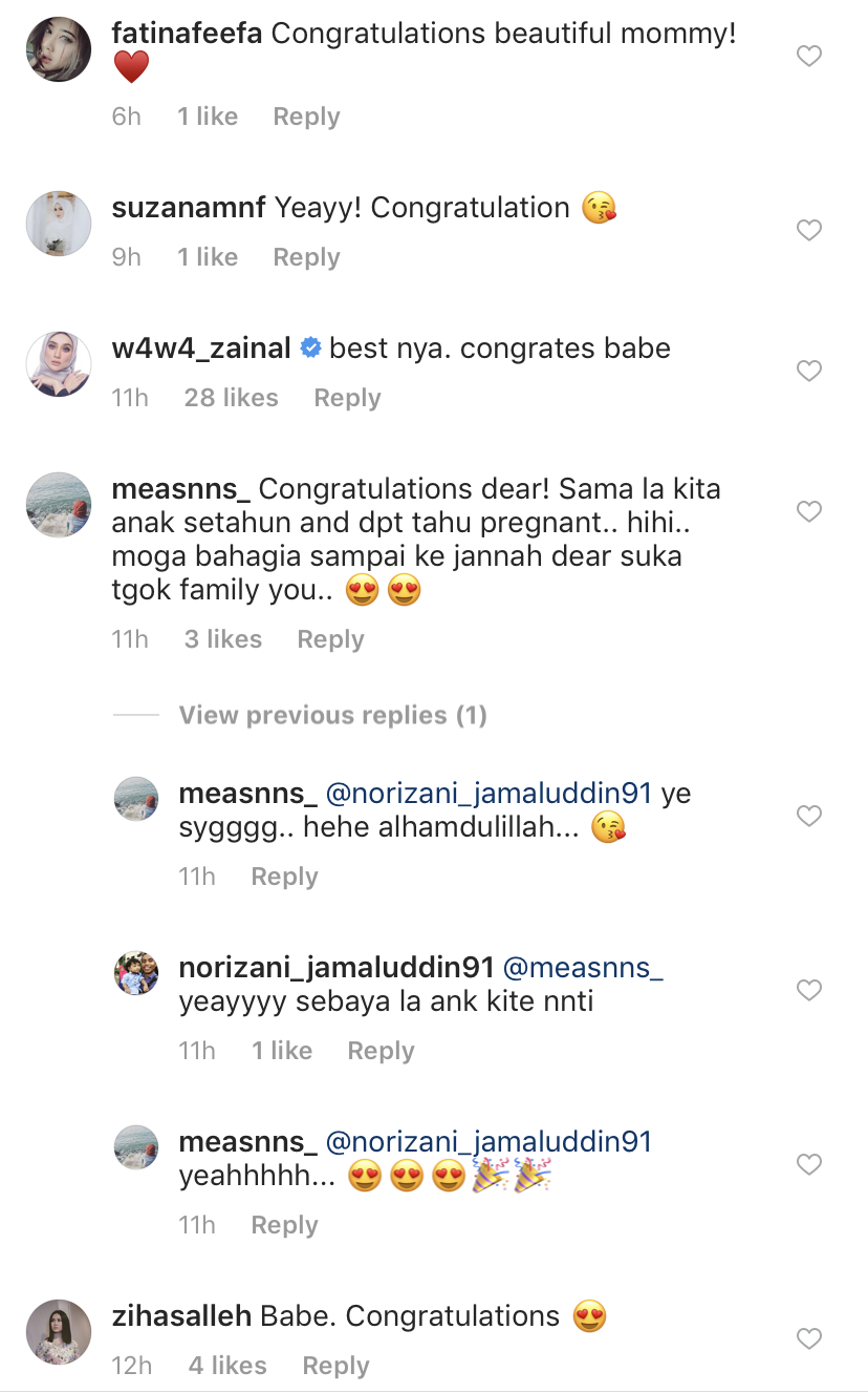 Rata-rata artis dan peminat mengucapkan tahniah serta mendoakan kebahagiaan keluarganya.