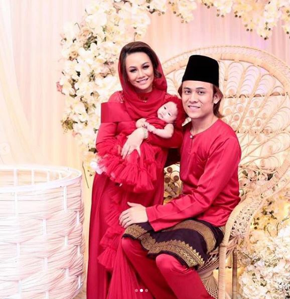 Pasangan tersebut kelihatan ceria sedondon dengan busana merah bersama bayi yang diraikan iaitu Eshaal.