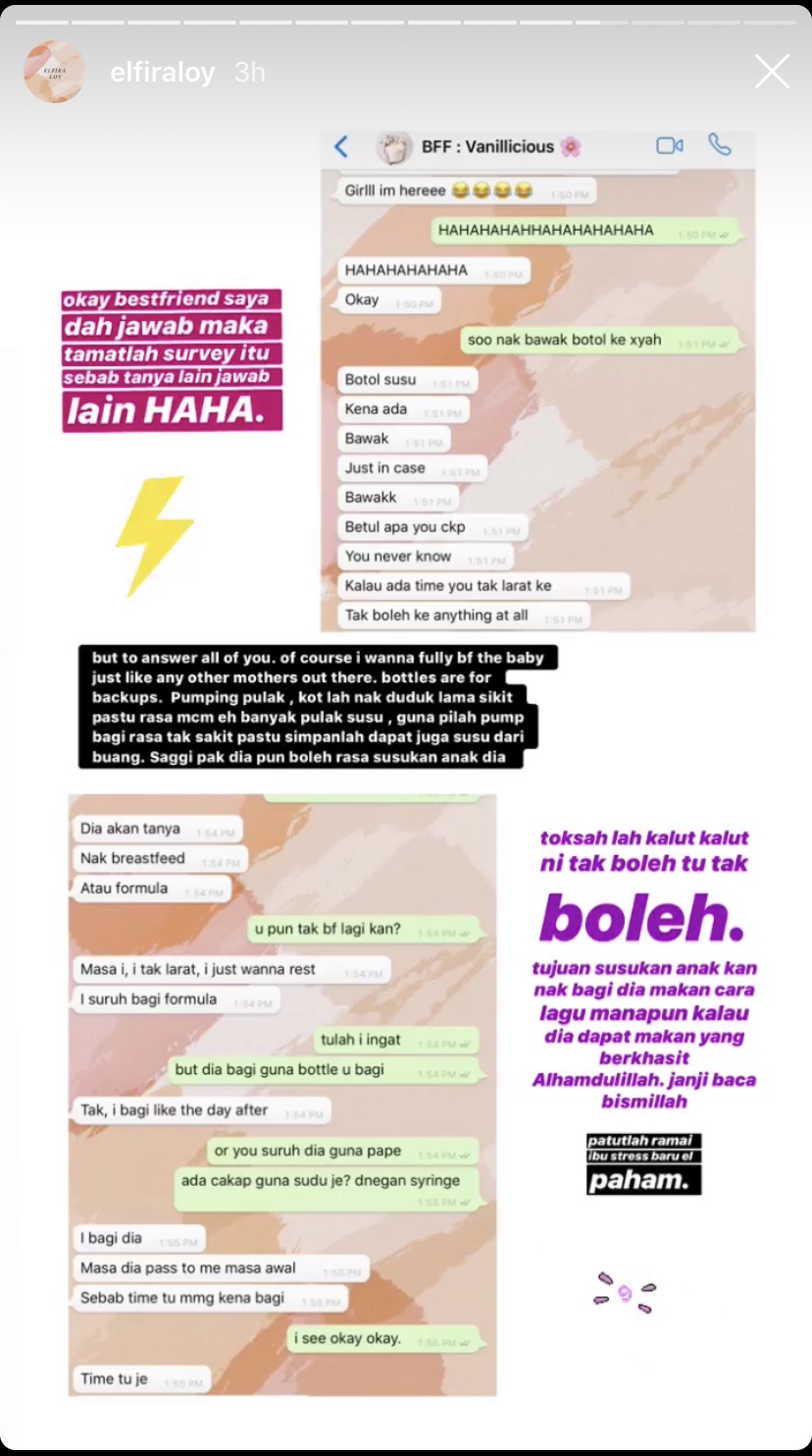 Dalam pada itu, Elfira atau nama sebenarnya Nurul Elfira Loy berpesan kepada netizen supaya ingat dengan tujuan asal untuk menyusukan anak.