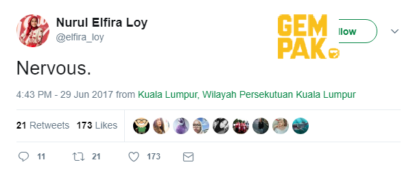 Kata Kak E, Elfira juga ada menulis 'Nervous' dan '39600' saat pada ruangan status di laman sosial Twitternya seolah-olah sedang memberikan gambaran tentang debarannya menanti sesuatu.