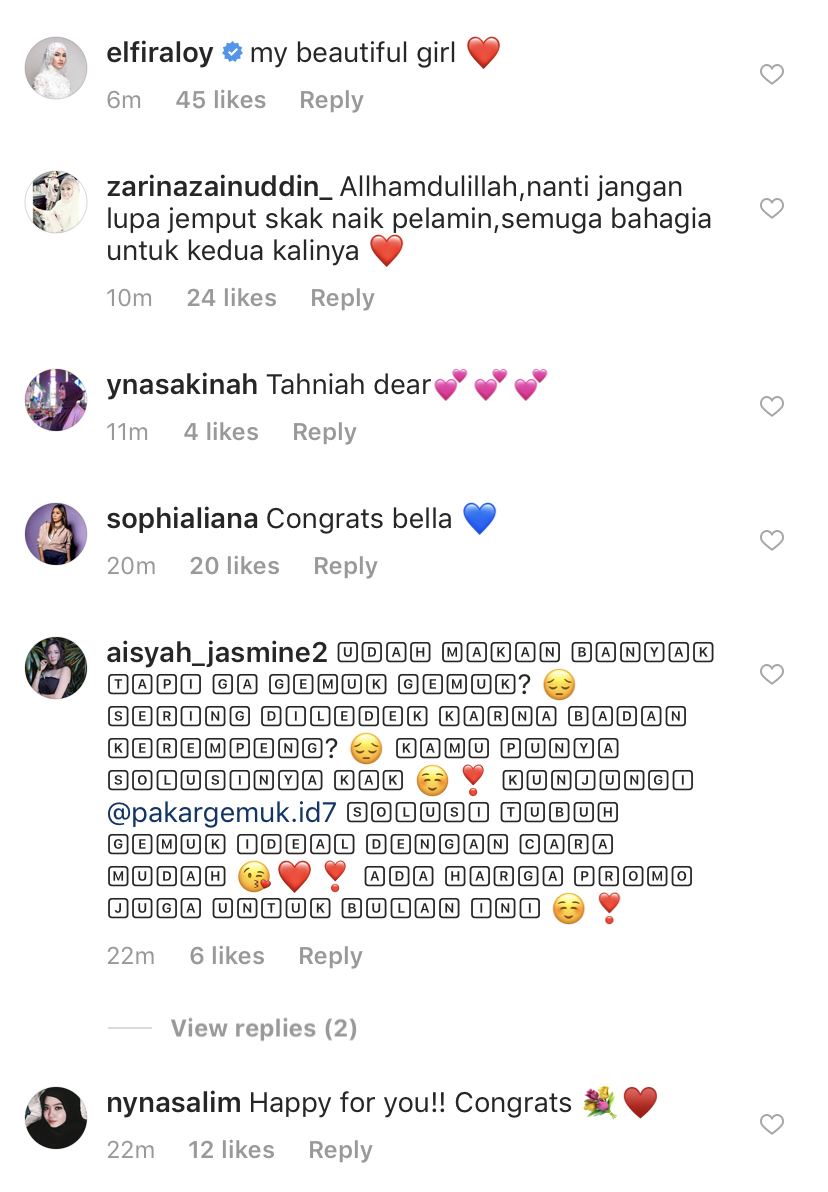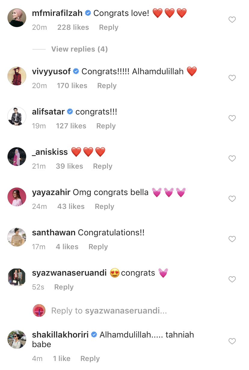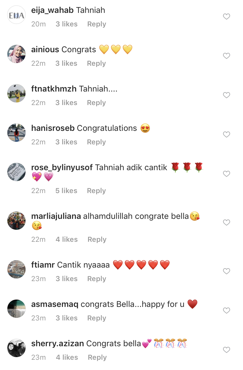 Rata-rata rakan artis dan peminat Bella mengucapkan tahniah kepada Bella serta mendoakan agar segalanya berjalan dengan lancar.