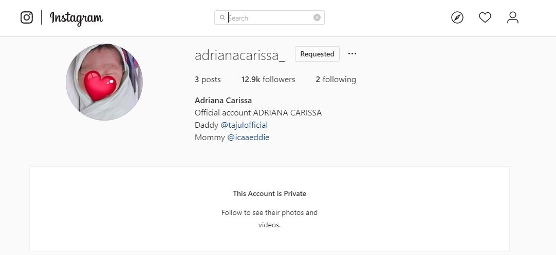 Menerusi tinjauan Gempak, akaun IG @adrianacarissa_ kini sudah memiliki 12.9 ribu orang pengikut walaupun masih dalam mood privacy.