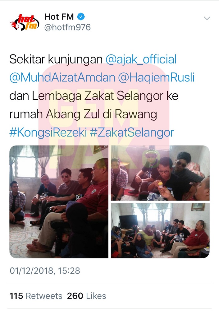 Sabtu lalu, menerusi program GPH Kongsi Rezeki anjuran Hot FM bersama Lembaga Zakat Selangor, penyampai radio Ajak Shiro bersama dua orang artis undangan, Aizat Amdan dan Haqiem berkunjung ke rumah seorang asnaf di Rawang, Selangor yang dikenali sebagai Abang Zul.