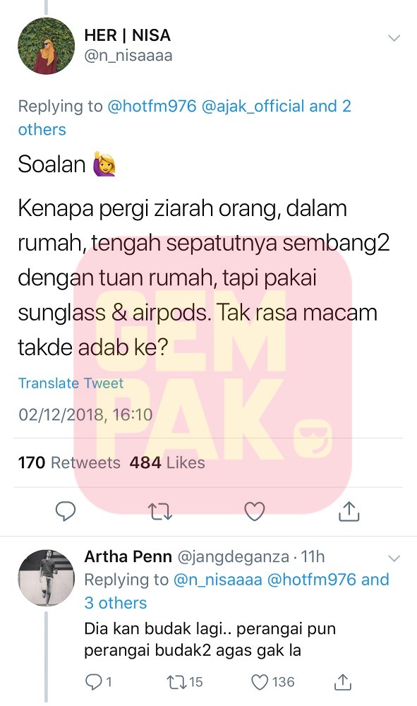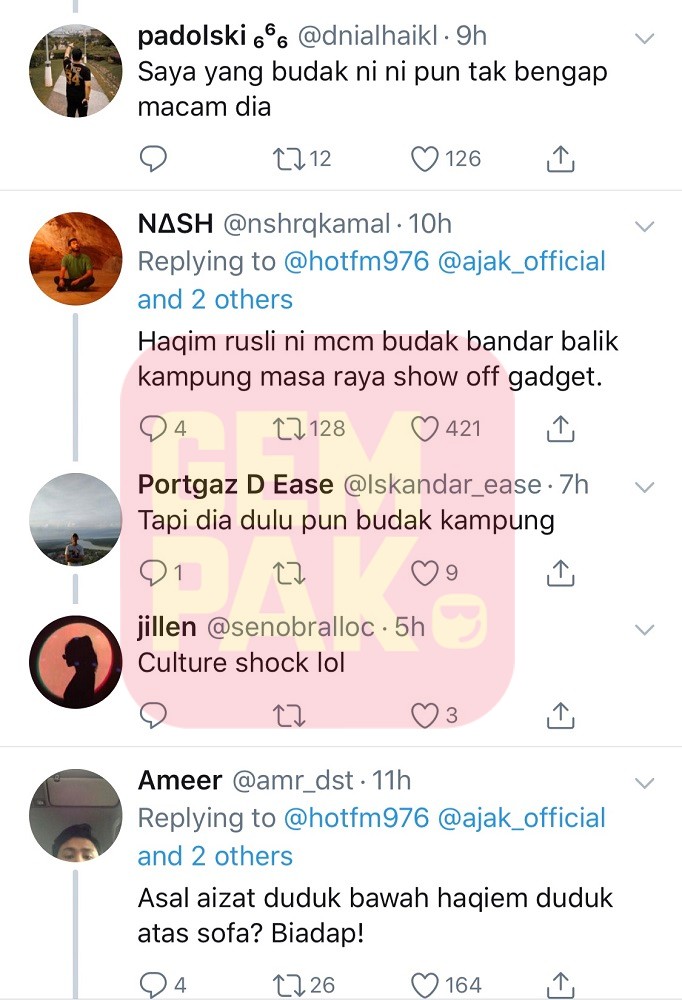 Warga Twitter mula menyelar penampilan pelantun lagu Tergantung Sepi itu dan berpendapat Haqiem sepatutnya menanggalkan terlebih dahulu cermin mata hitam serta 'airpods' miliknya sebelum menziarahi rumah seseorang.