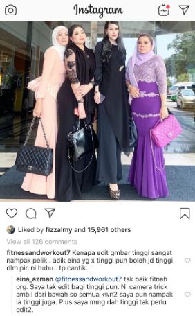 "Tak baik fitnah orang, saya tak edit bagi tinggi pun, ni camera trick ambil dari bawah so semua kawan-kawan saya pun nampak la tinggi juga, plus saya memang dah tinggi, tak perlu edit,"balasnya.