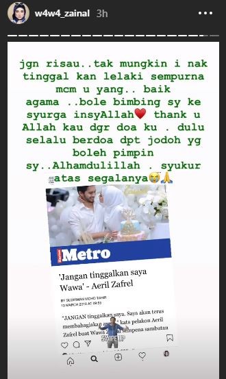 “Dulu selalu berdoa dapat jodoh yang boleh pimpin saya. Alhamdulillah, syukur atas segalanya,” tulis Wawa.