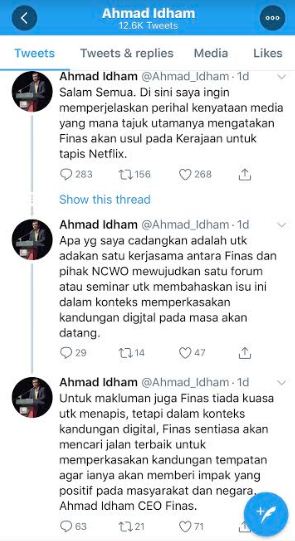 Ketua Pegawai Eksekutif (CEO) Perbadanan Kemajuan Filem Nasional Malaysia (FINAS), Ahmad Idham mencadangkan pihak kerajaan untuk menapis kandungan Netflix pada Sabtu.