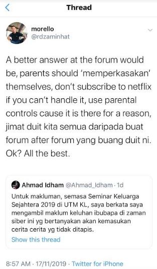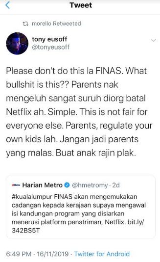 Menurut Sakinah, cadangan itu tidak rasional kerana plaform Netflix sudahpun menyediakan pilihan untuk ibu bapa memilih kandungan yang boleh ditonton oleh anak-anak.